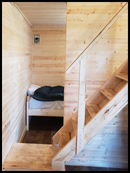The Perch cabin was built in the fall of 2020, and completed the spring of 2021. This cabin sits up high and overlooks the South bay. Sleeps 5 and has Flush toilet.