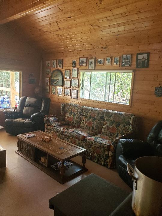 The Original cabin that was here when we bought the lodge we have named the Boreal cabin, after the Man we bought this place from. His business name was Boreal Camps and Outfitting, so we found the name very fitting. This is an incredible 3 bedroom cabin, with a big deck out front and a large living room. We have since put in power, flush toilet and a covered deck!!!